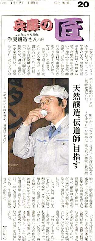 新聞の連載コラム「兵庫の匠」に取り上げていただきました。スローフードが見直されて、あちこちから、講演の依頼が増え、なかなか研究に没頭できない日々が続きますが、今一番大事なことは「家庭から手作りの味を消えさせてはいけない」ということと信じて飛び回っています。こうして新聞に取り上げていただくことで、多くの方にスローフードのよさを知っていただければと考えています。